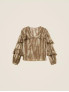 Опис: Широка блуза від TWINSET виконана з легкого крепонового матеріалу з анімалістичним принтом у відтінках коричневого з люрексом. Має багатошарові волани, довгі рукави, вільний крій. Виріб виготовлений в Італії. Лінія крою — широка (wide fit).