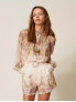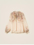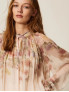 Опис: Легка блуза з крепдешину вільного крою з довгими рукавами та круглою горловиною доповнена внутрішнім топом, що забезпечує комфортну посадку та непрозорість, зберігаючи при цьому повітряний, романтичний силует у фірмовій естетиці Twinset. Широкий фасон і м’яке драпірування тканини дозволяють блузі красиво рухатися, роблячи її доречною як для щоденних міських образів, так і для більш вишуканих виходів у теплий сезон. Віскоза приємна до тіла та добре пропускає повітря, а поліестеровий топ зберігає форму й полегшує догляд, поєднуючи практичність із виразною жіночною естетикою виробу.