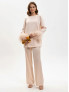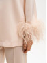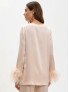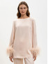 ​Опис: Блузка має легкий шифоновий крій з довгими рукавами, знімним декором з пір'ям страуса та блискучою текстурою з металевим логотипом, що створює ефектний вечірній силует з акцентами гламуру та жіночності. Виріб з гладкого ацетатного полотна з поліестровою основою підходить для весняно-літнього сезону та особливих подій, поєднує естетику вишуканої елегантності з практичністю знімних елементів декору для універсального стилю. Шовковиста тканина забезпечує комфортне носіння, приємне падіння та легкість у догляді ручним пранням чи хімчисткою.