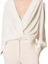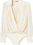 Опис: Боді має драпірування, яке елегантно підкреслює силует. Виконане з креп-шифону та нижньої частини з трикотажного джерсі для комфорту. Має V-подібний виріз із перехрещенням, довгі рукави з манжетами на ґудзиках, застібається застібкою-блискавкою. Рекомендації по догляду включають ручне прання в теплій воді з дбайливим режимом, не відбілювати, не сушити в пральній машині, прасувати при низькій температурі, хімічне чищення з обережністю. Модель відрізняється витонченістю і підходить для створення елегантних образів.