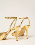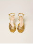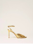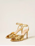 Опис: Елегантні босоніжки на підборах 10 см, виконані з ламінованої шкіри кольору золота (Gold Tejus). Мають тонкий ремінець на щиколотці з регульованою пряжкою для комфортної посадки. Підошва виготовлена зі шкіри, що забезпечує міцність і комфорт при носінні. Ця модель ідеальна для урочистих подій, поєднуючи стильний вигляд і високоякісні матеріали від бренду TWINSET.