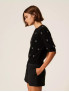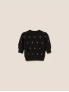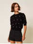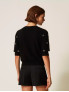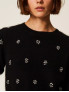 Опис: Светр з круглым вирізом і короткими рукавами від TWINSET, виконаний у м’якій ангоро-суміші з гладкою в’язкою та декоративними аплікаціями-фактурами у вигляді квітів з металевих заклепок. Лінія силуету — м’яка (loose fit), на спинці — пластинка-логотип Oval T, оздоблена нитками. Модель чудово поєднується з вузькими джинсами або спідницею-олівець для стильного міського образу.