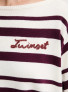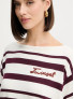 Опис: Светр з шириною і вільним кроєм, з класичним круглим вирізом горловини, довгими рукавами з опущеним плечем. Фактура трикотажу в горизонтальні білі і чорні смужки з логотипом бренду, вишитим на грудях коралового кольору. Ребристі манжети і низ для захисту від холоду. Підходить для комфортного повсякденного носіння, стиль casual. Розмір S, зріст моделі близько 175-178 см. Рекомендовано ручне прання.