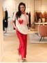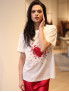 Опис: Футболка має вільний крій із класичним круглим вирізом і короткими рукавами, спереду прикрашена графічним принтом і розсипом страз, що додає виразного акценту та створює сучасний, але лаконічний силует. Трикотаж з еластичної бавовни приємний до тіла, добре пропускає повітря й підходить для весняно-літнього сезону та міжсезоння, забезпечуючи комфорт під час тривалого носіння. Поєднання натурального волокна з еластаном гарантує м’яке прилягання без обмеження рухів, збереження форми після прання та простоту догляду, а універсальний дизайн легко поєднується з джинсами, шортами чи спідницями у casual і smart-casual образах.