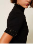 Опис: М'який і розслаблений светр з трикотажу, що розтягується, з високим горлом і короткими широкими рукавами. Край рукавів прикрашений стразами, що додає виробу святковий вигляд. На спині розташована овальна нашивка з логотипом "T". Виготовлений для комфорту в осінньо-зимовий сезон 2025/26.