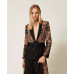 Рожевий жакардовий блейзер з квітковим принтом, ексклюзивний для Twinset. Лацкани, однобортна застібка на ґудзики, довгі рукави, прорізні кишені з клапаном, підкладка, знімний пояс у тон, прямий крій. Ідеально підходить для вечірок та офіційних випадків.