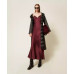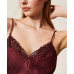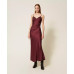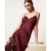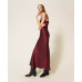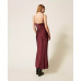 Довга атласна сукня косого крою з вирізом горловини, оздобленим мереживом у тон. Має тонкі бретелі, застібку-блискавку та бляшку з логотипом у формі овальної літери «Т» на спині. Приталений силует. Ідеально підходить для вечірок та особливих випадків.