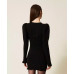 Коротка в'язана сукня з перфорованим ефектом в'язання гачком спереду. Вона має круглий виріз горловини, об'ємні довгі рукави зі зібраними манжетами, фестончастий низ та приталений крій.