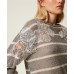 Светр із мохерової суміші з двоколірними смужками та мереживними деталями ручної роботи з вишивки та інтарсії. Виріб вільного крою має імітацію горловини-човника, довгі рукави з розрізами на ребристих манжетах та табличку з логотипом "Oval T" ззаду.