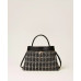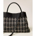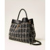 Сумка-шопер з жакардового твіду з гладкою обробкою під телячу шкіру. Має подвійне внутрішнє відділення та передню кишеню на блискавці з персоналізованим замком у формі овальної літери. Має коротку трубчасту ручку та знімний регульований плечовий ремінь для носіння через плече.