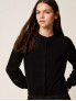 Опис: Кардиган від TWINSET з круглим вирізом, виконаний у фактурній в’язці «косичка» з декоративними вставками з люрексу. Модель має прямий силует, довгі рукави та застібку на гудзики. На спинці розташована металева пластинка у формі серця — фірмова деталь бренду. Кардиган поєднує м’якість пряжі та легкий блиск, підходить для елегантних міських образів, гарно комбінується з джинсами, спідницями міді та класичними брюками.