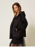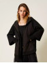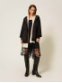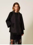 Опис: Жіноче пальто-кобан від TWINSET, виконане з тканини scuba і нейлону з легким стьобаним ефектом. Має капюшон, рукави-raglan із широкими манжетами-авіатами, передню застібку на металеву блискавку, приховану під планкою з кнопками, кишені-підрізи, металеву пластинку з логотипом на капюшоні та злегка розкльошений силует (linea slightly flared). Колір: чорний або camel.