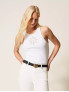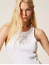 Опис: Облегаюча майка з ребристої бавовни, прикрашена інтарсійною вишивкою у вигляді мандали спереду, що створює елегантний декоративний акцент. Кругла горловина та приталений силует забезпечують комфортне прилягання до тіла, роблячи модель ідеальною для щоденного носіння цілий рік як самостійний топ або основа для багатошарових образів. Практичність поєднується з вишуканим стилем, дозволяючи легко комбінувати з різними елементами гардеробу для жіночних і сучасних луків.