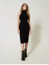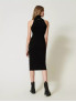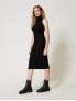 Опис: Ця чорнота в'язана сукня з колекції Twinset Milano має приталений силует, що підкреслює фігуру, та без підкладки, забезпечуючи комфорт і свободу рухів. Сукня виготовлена з еластичної суміші віскози та поліестеру, які добре тримають форму і забезпечують приємні тактильні відчуття. Модель ідеально підходить для демісезонного періоду і поєднує стильний вигляд із практичністю для повсякденного та святкового вбрання.