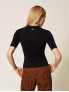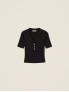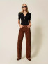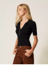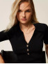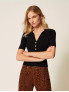 Опис: Приталене поло з тканини креп-віскоза з глибоким V-подібним вирізом і комірцем. Має короткі рукави і застібку на декоративні ґудзики з коштовним блиском. Легкий та еластичний матеріал, ідеальний для стильного casual образу осінь-зима 2025/26. На спині - металева овальна нашивка з логотипом "T". Розмір моделі S/40, зріст 178 см. Рекомендований ручний догляд.