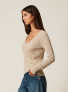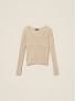 Опис: Рифлений пуловер TWINSET з лінії Actitude, виконаний із м’якої змішаної пряжі з додаванням вовни. Тонкий трикотаж з фактурною рубчастою в’язкою комфортно прилягає до тіла та підкреслює силует, не сковуючи рухів. Модель має V-подібний виріз горловини, довгі рукави та вузькі манжети й низ, вив’язані резинкою, що допомагає зберігати форму. Бежевий меланж додає виробу м’якості й універсальності, легко поєднується як із базовою, так і з акцентною палітрою гардероба. Пуловер ідеально підходить для повсякденних і офісно-міських образів: гарно виглядає з джинсами, класичними або широкими штанами, спідницями міді та жакетами, а також як нижній шар під пальто чи тренч.