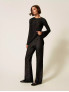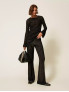 Опис: Стильні брюки з трикотажу з подвійною двокольоровою структурою і вирізами на зовнішній частині штанин, що створюють透гу. Висока еластична талія забезпечує комфорт і ідеальну посадку. Модель має розкльошені штани і прикрашена овальною нашивкою логотипу T на талії. Ідеальний варіант для сучасного гардеробу, створює витончений і модний образ.