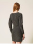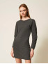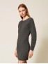 Опис: Еластичне трикотажне плаття середнього сірого кольору з приталеним силуетом. Має круглий виріз горловини, широкі довгі рукави і діагональний рельєфний візерунок, що підкреслює форму тіла. Виріб ідеально підходить для повсякденного та святкового образу сезону осінь-зима 2025/26. Довжина міні, бренд логотип розміщений на спині.