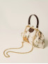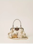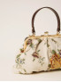 Опис: Сумка-плече від TWINSET шитa з жакардової тканини з квітковим візерунком і люрексовою ниткою. Має металевий каркас із застібкою-кнопкою, коротку ручку-петлю, знімний ланцюговий ремінь для носіння через плече або на плече, і шкіряний ярлик з логотипом бренду. Універсальна за розміром (34×21×5 см), ідеальна як для денного, так і для вечірнього образу.