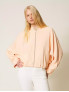 Опис: Бомбер з флюїдного твілу з домішкою віскози, з рюшами на подолі, металевою блискавкою, довгими рукавами-кімоно з високими манжетами, передніми кишенями та підкладкою з креп-де-шину створює вільний силует. Модель з колекції Весна-Літо 2026 пофарбована в рожевий "Peach Pink", виготовлена в Італії, підходить моделі зростом 178 см (розмір XS/40). Рекомендується ручне прання при кімнатній температурі, без хлору, сушіння на повітрі, низькотемпературна прасування та делікатна хімчистка.