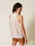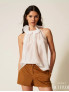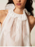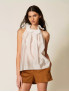 Опис: Топ 261AP2184 виконаний із легкої напівпрозорої вуалі та має вільний, розкльошений крій із м’яким падінням від лінії плечей, завдяки чому силует виглядає повітряно й не обмежує рухів. Верх оформлений об’ємним хвилястим воланом по горловині з тонким формотримальним кантом усередині, що дозволяє коміру красиво стояти та створює ефект «коміра‑облака», а виріз гальтер відкриває плечі й підкреслює шию. Легкий ліоцел у поєднанні з поліестером забезпечує приємні тактильні відчуття, гарну повітропроникність і стійкість до зминання, тож модель ідеально підходить для сезону весна‑літо, урочистих заходів і вечірніх виходів; топ однаково ефектно поєднується зі спідницями‑максі, широкими брюками та джинсами, додаючи образам сучасної романтичності.