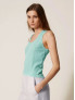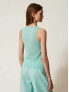 Опис: Вільний трикотажний топ без рукавів повністю декорований дрібними пайєтками, завдяки чому створює м’який блиск і водночас зберігає комфорт посадки. Поєднання бавовни й поліаміду забезпечує приємне прилягання до тіла, еластичність та стійкість форми, а гладка підкладка з поліестеру додає виробу структури та запобігає дискомфорту під час руху. Лаконічний силует дозволяє легко інтегрувати топ у повсякденні та вечірні образи, поєднуючи його з брюками-палаццо, спідницями чи жакетами, щоб підкреслити сучасну, святкову естетику Twinset без перевантаження деталями.