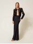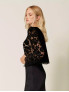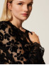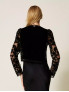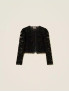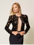 Опис: Вишуканий короткий жакет з основою з чорно матового тюлю, декорований розкішною оксамитовою вишивкою в стилі бароко. Має круглий виріз із застібкою на гачок, довгі рукави з мереживними зубчиками на манжетах та у низу виробу, що надає легкості і романтичності. Спинка прикрашена металевою овальною логотипною табличкою "T". Ідеальний вибір для вечірніх образів, поєднує витонченість тканини і сучасний крій.