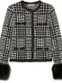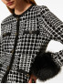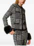 Опис: Жакет-кардиган від TWINSET виконаний з в’язаної тканини з жакардовим рисунком у стилі «чек» і «п’є-де-пуль». Модель має круглий виріз, застібку на ґудзики з логотипом Oval T, довгі рукави знімними манжетами з еко-хутра та декоративну відстрочку пайєтками по краю. Силует — вільний (loose fit), модель у кольорі Snow White/Black. Ідеально підходить для елегантних міських образів.
